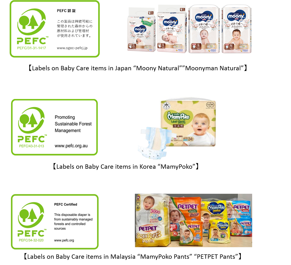 Amongst the products produced in factories acquiring PEFC CoC certification, PEFC certification labels are on baby care diapers “Moony Natural” and “Moonyman Natural” in Japan and “MamyPoko Pants” and “PETPET Pants” in Malaysia.