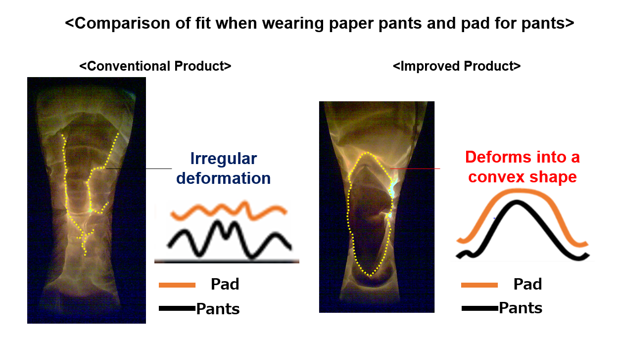 - Even when used in combination with a pad for pants, both the disposable pants and the pad deform synchronously into a convex shape, providing a perfect fit to the body.