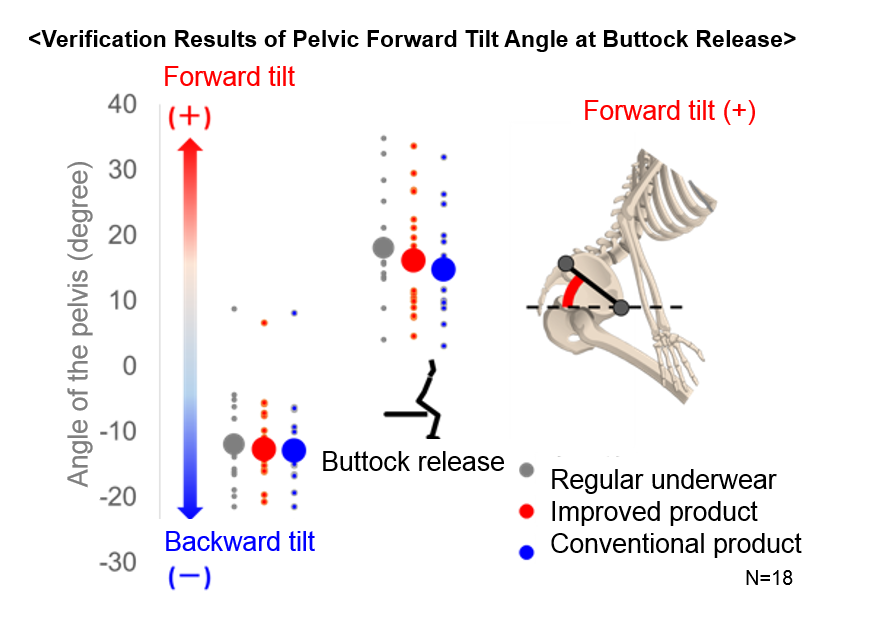 In this study, we examined the impact of the combination of disposable pants and pad for pants on the standing-up motion. It was revealed that the combination of the newly improved disposable pants, which deform according to the body's shape in the crotch area, and pad for pants resulted in an improved forward tilt angle of the pelvis during the standing-up motion compared to conventional products, making the motion more similar to that when wearing regular underwear.
