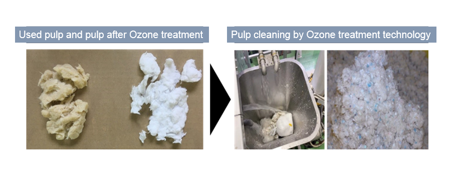 - When recycling used disposable pants, the materials are separated into "pulp," "super absorbent polymer," and "plastic." Without using adhesive in the waistband makes it easier to separate and extract the "recycled pulp" with no residue from adhesives.