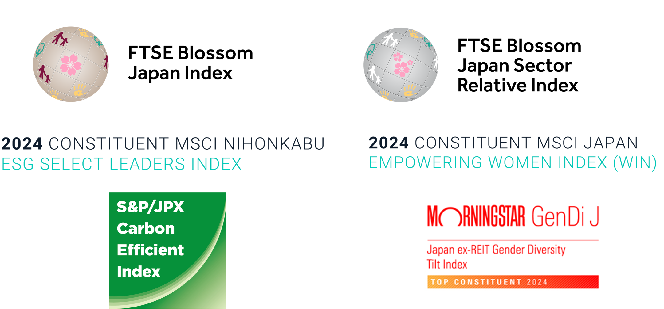 The "FTSE Blossom Japan Index" and "S&P/JPX Carbon Efficient Index Series" have been selected for six consecutive years. The "FTSE Blossom Japan Sector Relative Index" has been selected for three consecutive years. The "MSCI Japan Empowering Women Index (WIN)" has been selected for the fifth time.