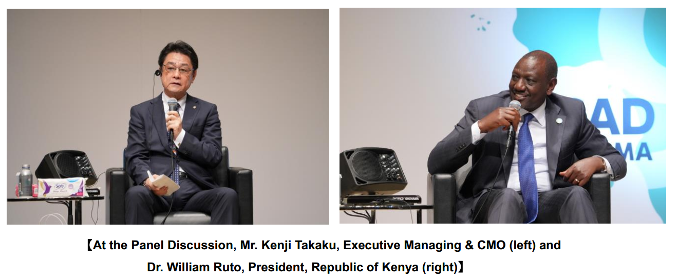 Unicharm Corporation (President & CEO: Mr. Takahisa Takahara) is pleased to announce that Mr. Kenji Takaku, Executive Managing and CMO, participated as a panelist in the “Public-Private Business Dialogue” held during the 9th Tokyo International Conference on African Development (TICAD9), which took place from August 20 to 22, 2025, at Pacifico Yokohama in Minato Mirai. He joined moderator Mr. Ken Shibusawa (Chairman of the Middle East and Africa Committee, Japan Association of Corporate Executives), Dr. William Ruto, President of Republic of Kenya, and three other panelists to discuss business strategies and proposals for addressing social challenges in the African market.