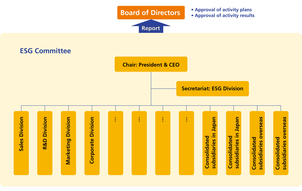 Unicharm has established an appropriate system to steadily implement sustainability management. Specifically, the ESG Committee, chaired by the president & CEO, meets four times a year to deliberate and decide on all sustainability matters and governance-related policies and activities, and monitors their progress. The ESG Committee is attended not only by directors, executive officers, and other members of management, but also by those in charge of the Sales Division, R&D Division, Marketing Division, Corporate Division, and consolidated subsidiaries in Japan and overseas, and has a system in place to quickly carry out the various sustainability-related activities that are decided by its members. Matters deliberated and decided on by the ESG Committee are reported to the Board of Directors at least once a year.