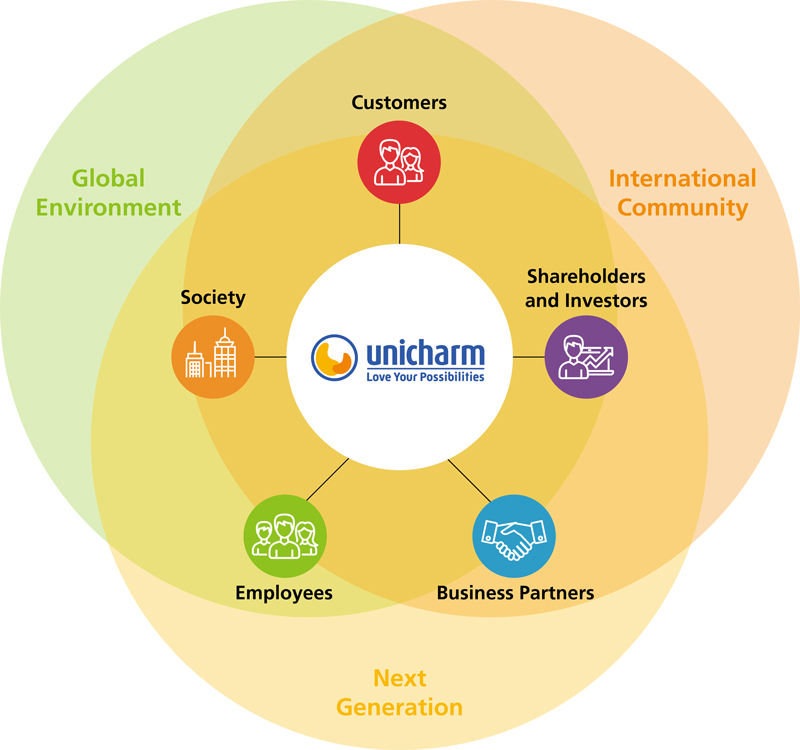 Guided by our Beliefs & Pledges, Corporate Code of Conduct, and Multi-Stakeholder Policy, which vow that Unicharm will undertake honest corporate activities that win the fullest confidence of its customers, shareholders and investors, business partners, employees, and society, we are working to increase stakeholder engagement through a range of opportunities. In addition, as a company that provides consumables that are essential to a hygienic lifestyle, we regard the global environment, international community, and next generation as important stakeholders.