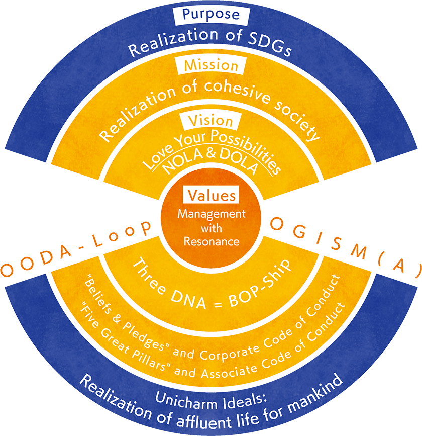 “Value” is the ambition and sense of duty that underlies our mission and vision, bringing it all together to serve a common purpose. All Unicharm employees around the world are now pushing forward our standardized management model: management with resonance.