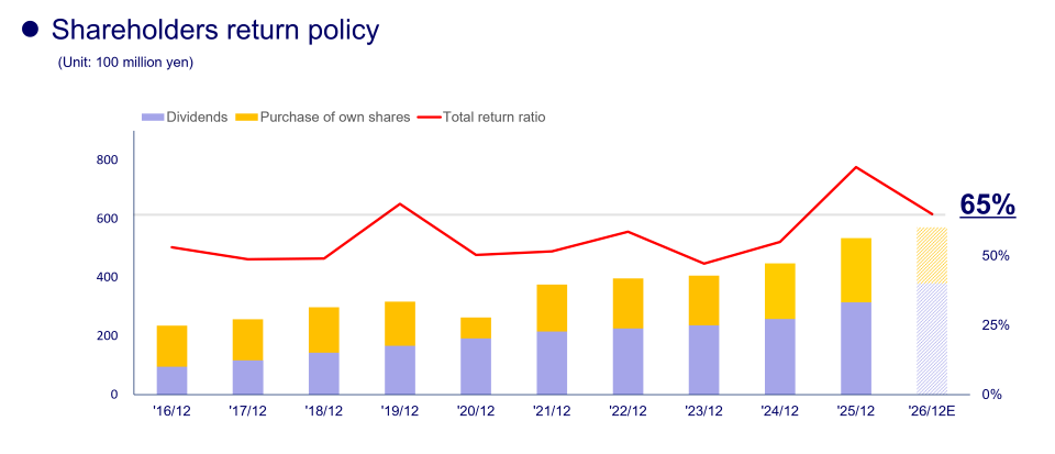 Under the 13th Medium-Term Management Plan announced in February 2026, we will significantly raise this target to "65% or more". Furthermore, we commit to maintaining a DOE (Dividend on Equity ratio) of over 4.5% for the next five years.