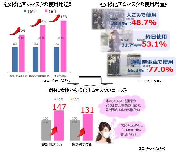 近年、春から夏にかけては花粉対策や猛暑による室内のエアコンでの乾燥防止、秋から冬にかけては通勤時の電車やオフィス・学校などの人が多く集まる場所での風邪・インフルエンザ・夏風邪が気になる時期に、一年を通じてマスクを着用する方が、増加傾向にあります。その結果、マスク市場の規模は、昨年対比で106%と継続して成長しています。