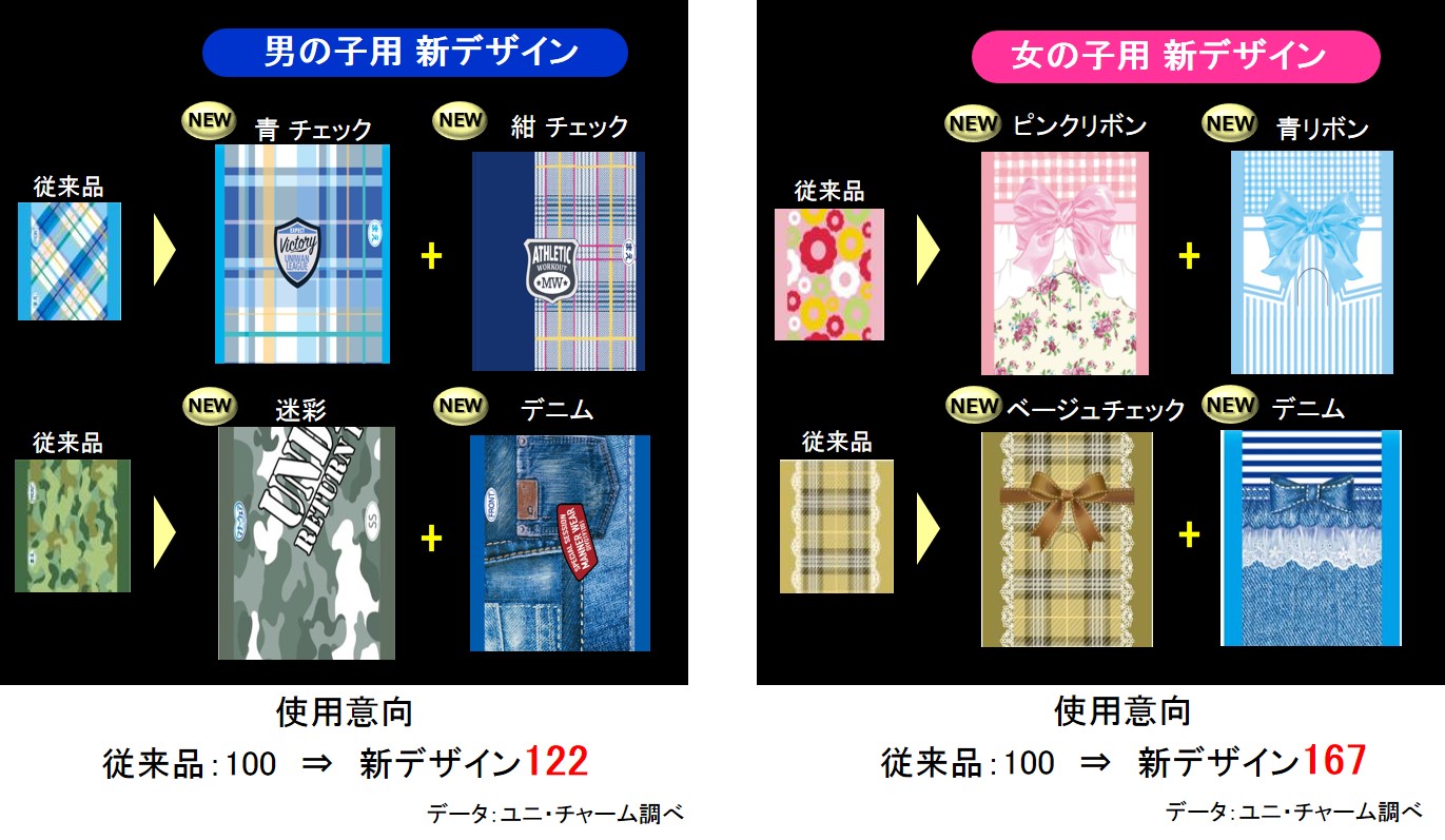 男の子用、女の子用ともに、従来品のデザインを上回る高い使用意向を獲得しました。