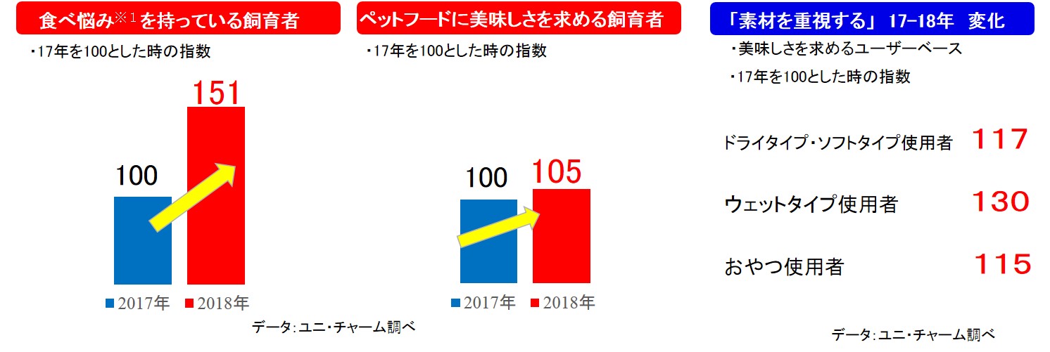 近年の小型犬化により、食べ悩み※1を持っている飼育者が増加し、ペットフードに美味しさを求めるニーズが高まっています。その美味しさを求めている飼育者は、“素材”による美味しさを重視していることから、犬のグルメ市場の拡大につながっています。