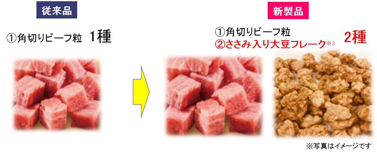 (1) 「ささみ入り大豆フレーク※2」が入って素材の種類が豊富になりました。