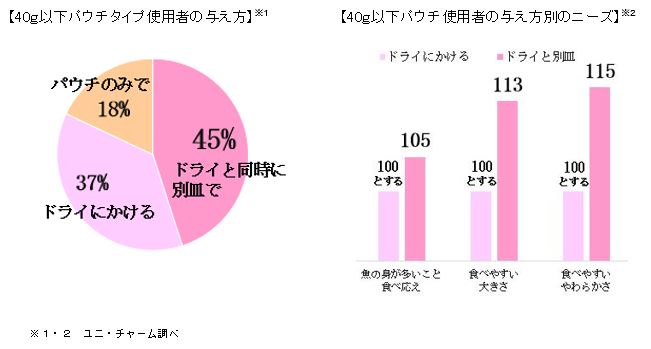 今回新たに、40g以下の小容量のパウチタイプを与えている飼い主様の約5割の方が、ドライフードと同時にパウチタイプを別皿でサイドディッシュのように与えており、食べ応えや食べやすさを重視していることがわかりました。