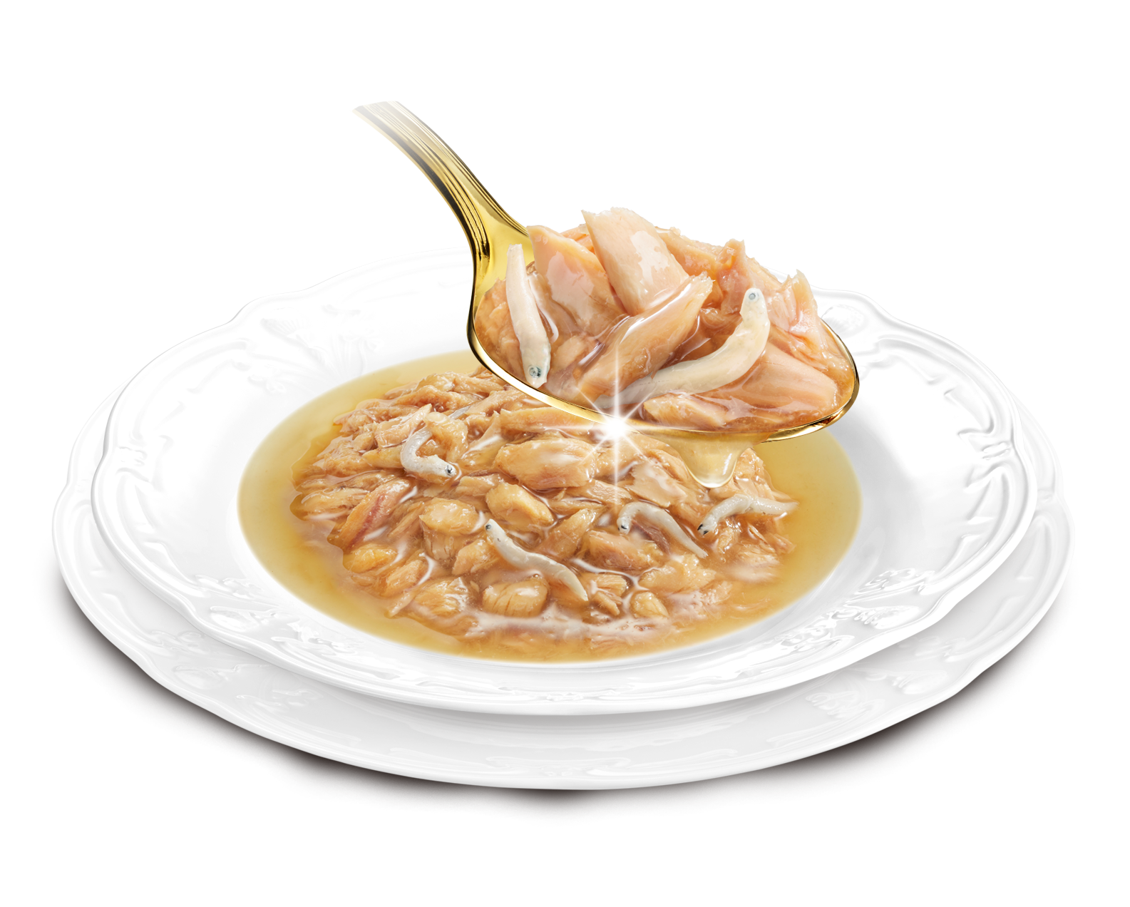 ねこが食べやすいように、お魚の身や具材と水分のとろみを絡めました。 - 食べやすいサイズのフレーク