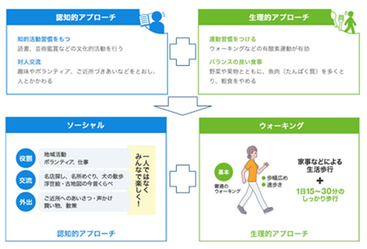 認知症予防には、適度な運動とバランスの良い食事で脳の健康状態を良好に保つ【生理的アプローチ】と、趣味やボランティア活動などで社会と接触し脳を刺激する【認知的アプローチ】を、双方バランスよく取り組むことが効果的と実証されています。