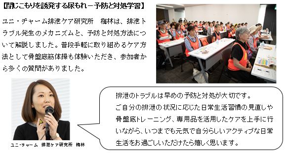 ユニ・チャーム株式会社(本社:東京都港区、代表取締役社長執行役員:高原豪久)は、このたび福岡県京都郡苅田町の新松山臨海工業団地に新たに建設した九州工場で、高齢化の進行に伴う「閉じこもり」や「認知症」といった社会問題の改善に寄与するため、目的を持って社会と触れ合う認知症予防『ソーシャル・ウォーキングⓇ』体験会と最新鋭の設備を備えた『工場見学』を、周辺の地域住民の方を対象に、2019年9月6日に実施しましたのでご報告します。