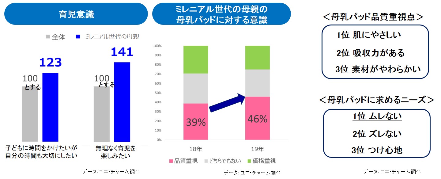 ミレニアル世代の母親は「自分のためのモノもきちんと選ぶ」傾向にあり、母乳パッドに対しても、品質を重視する意識が拡大しています。このような方が母乳パッドに求めている“品質”は、「肌へのやさしさ」「ムレの解消」「つけ心地まで良い」ということがわかりました。