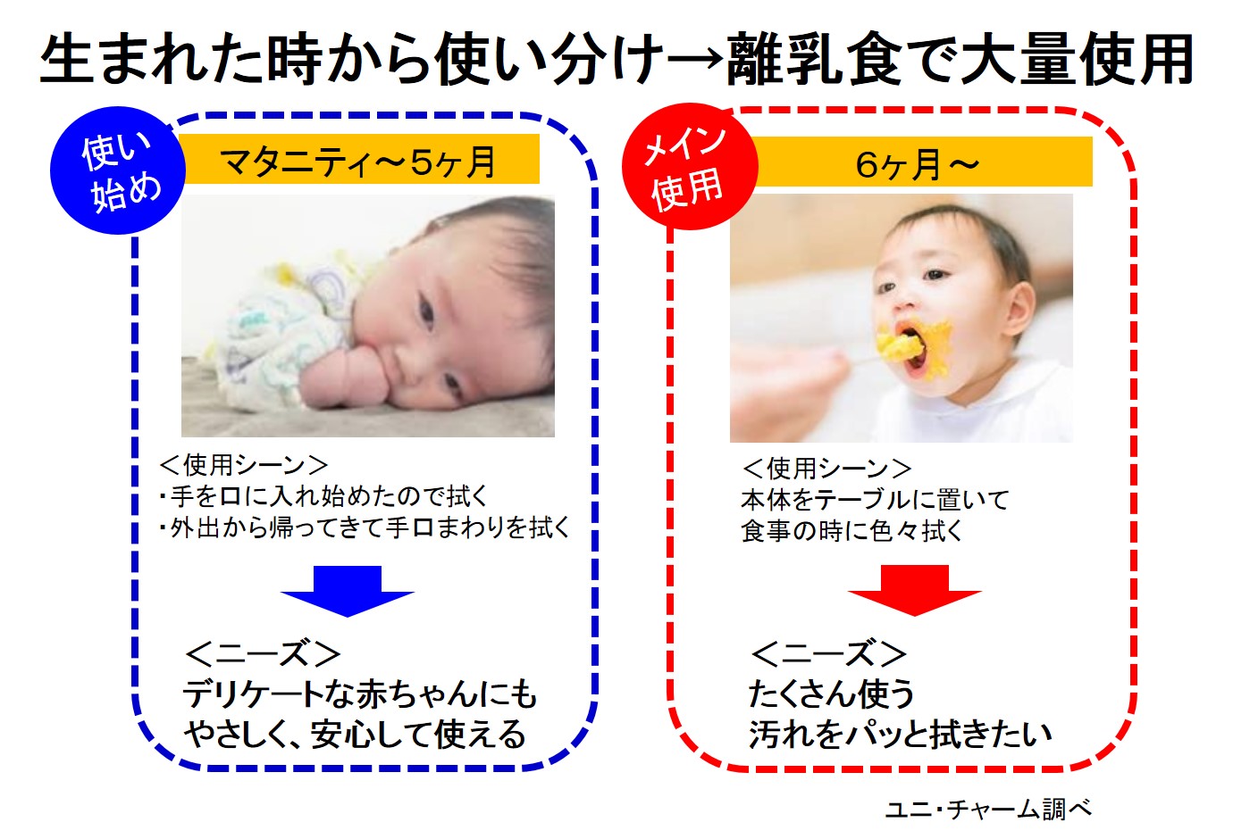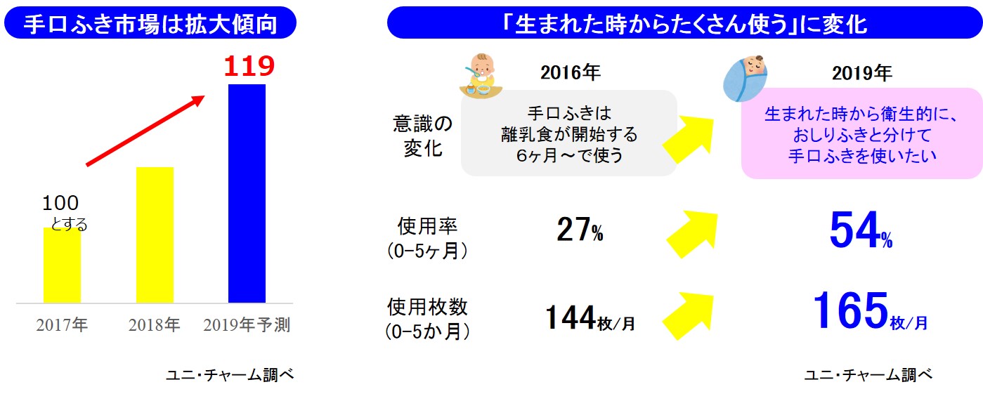 消費者の意識も「離乳食が開始する6か月から使う」(2016年)から「生まれた時からおしりふきと分けて使いたい」(2019年)に変化、赤ちゃんが0-5か月時の使用率も、27%から54%と大きく拡大しています。