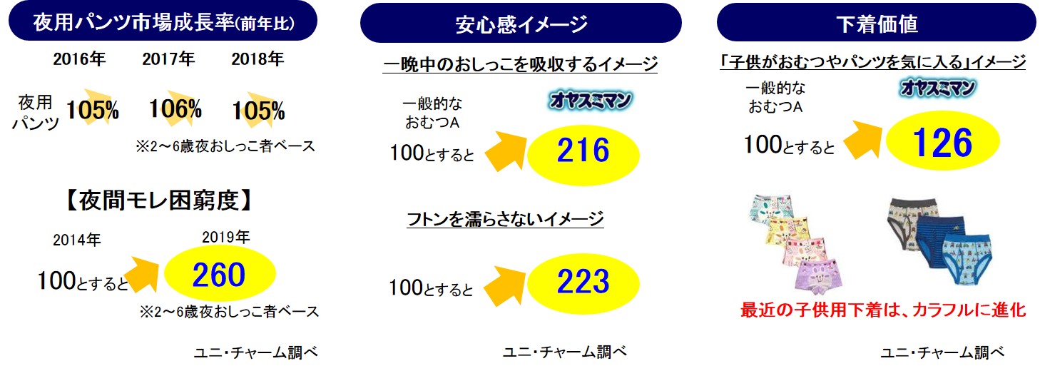 当社の「オヤスミマン」は、「一晩中のおしっこを吸収する」「フトンを濡らさない」という安心感イメージが、一般的なおむつを100とした場合、それぞれ200以上の非常に高いスコアを有しています。また、「子供が気に入る」というイメージも高く、圧倒的に高い市場シェアを獲得しています。