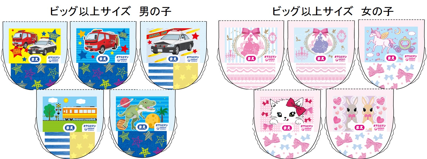 (1袋に、Lサイズは2種類、ビッグ以上サイズは5種類のデザインが入っています)