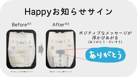 ユニ・チャーム株式会社(本社:東京都港区、代表取締役 社長執行役員:高原豪久)は、京都大学大学院教育学研究科の明和政子(みょうわ まさこ)教授と、育児に対する親の自己効力感を高める共同研究を行いました。その結果をもとに開発した、赤ちゃんがおしっこをするとポジティブなメッセージが浮かびあがる“Happyお知らせサイン”を搭載した「ナチュラルムーニー」※2を2019年11月上旬より全国で発売します。