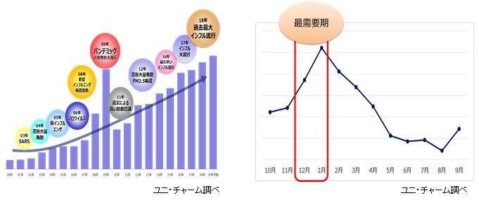 【年々高まるマスク市場(金額)の推移】 【年間でマスク需要が最も高まる時期】