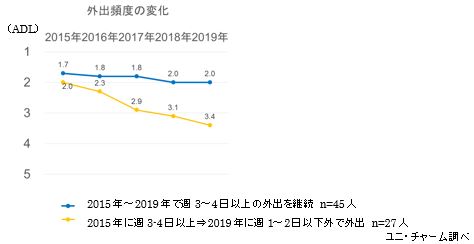 外出頻度が週に1~2回程度になるとADL(日常生活動作)は低下傾向となる。