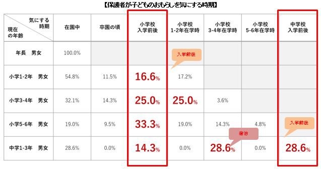 - 子どものおもらしについて親は「小学校の入学前」「小学3~4年生の時」「中学校入学前」などの子どもの生活環境の変化や、林間学校などの宿泊行事がある時期に意識が高まる。