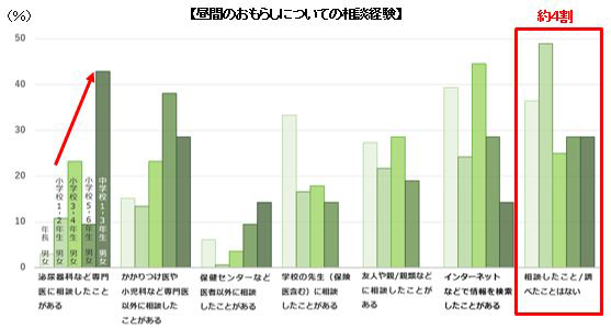 - 中学1~3年生での「昼のおもらし」の主な原因は、「緊張したりストレスがあるともれる」と回答した人の割合が高いことが判明した。