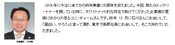 ユニ・チャームの理念は、NOLA&DOLA:すべての生活者がいつまでも自分らしく暮らせる社会の実現。これが私たちの目指す姿です。また、FC今治様の理念は、次世代のため、物の豊かさより心の豊かさを大切にする社会創りに貢献する、とあります。改めて双方の理念に高い親和性を感じました。それがこの度パートナーを務めさせていただく理由です。双方の理念実現に向けて今後とも一層のご支援を賜りますようお願い申し上げます。