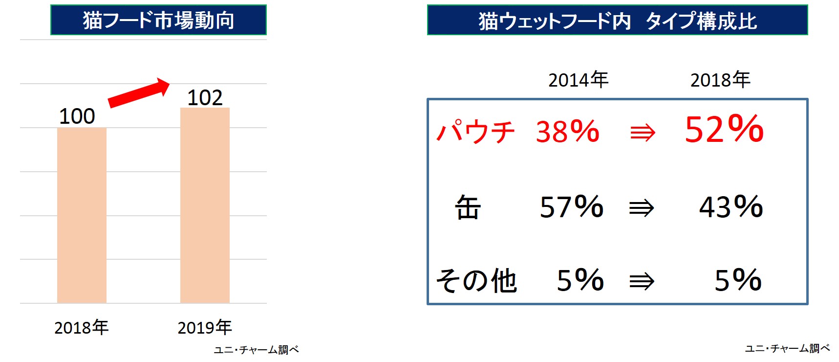 猫用フード市場は増加傾向にあり、2019年は前年と比較して102%成長しています。また、ウェットフードの中では、パウチタイプの構成比が年々拡大しています。