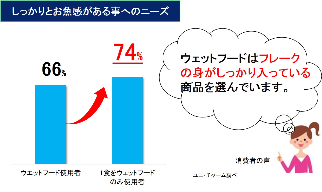 一方、猫のウェットフードの与え方は世帯によって様々です。その中でも、1食をウェットフードのみで与えている方は、フレークの身がしっかり入っている商品を好んでおり、身の量の多さなど「食べ応え」のニーズが高い傾向にあります。