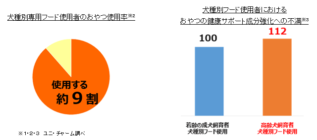 近年、犬においても高齢化が進行し、7歳以上の高齢犬の頭数構成比は5割※1を超えて推移しています。また犬種別専用フードの使用者は、食事で愛犬を喜ばせたいという気持ちが強く、約9割※2の方がおやつを与えています。その中でも、高齢犬を飼育している方は、おやつに対して健康に配慮した成分が配合されていることを重視することがわかりました。※3