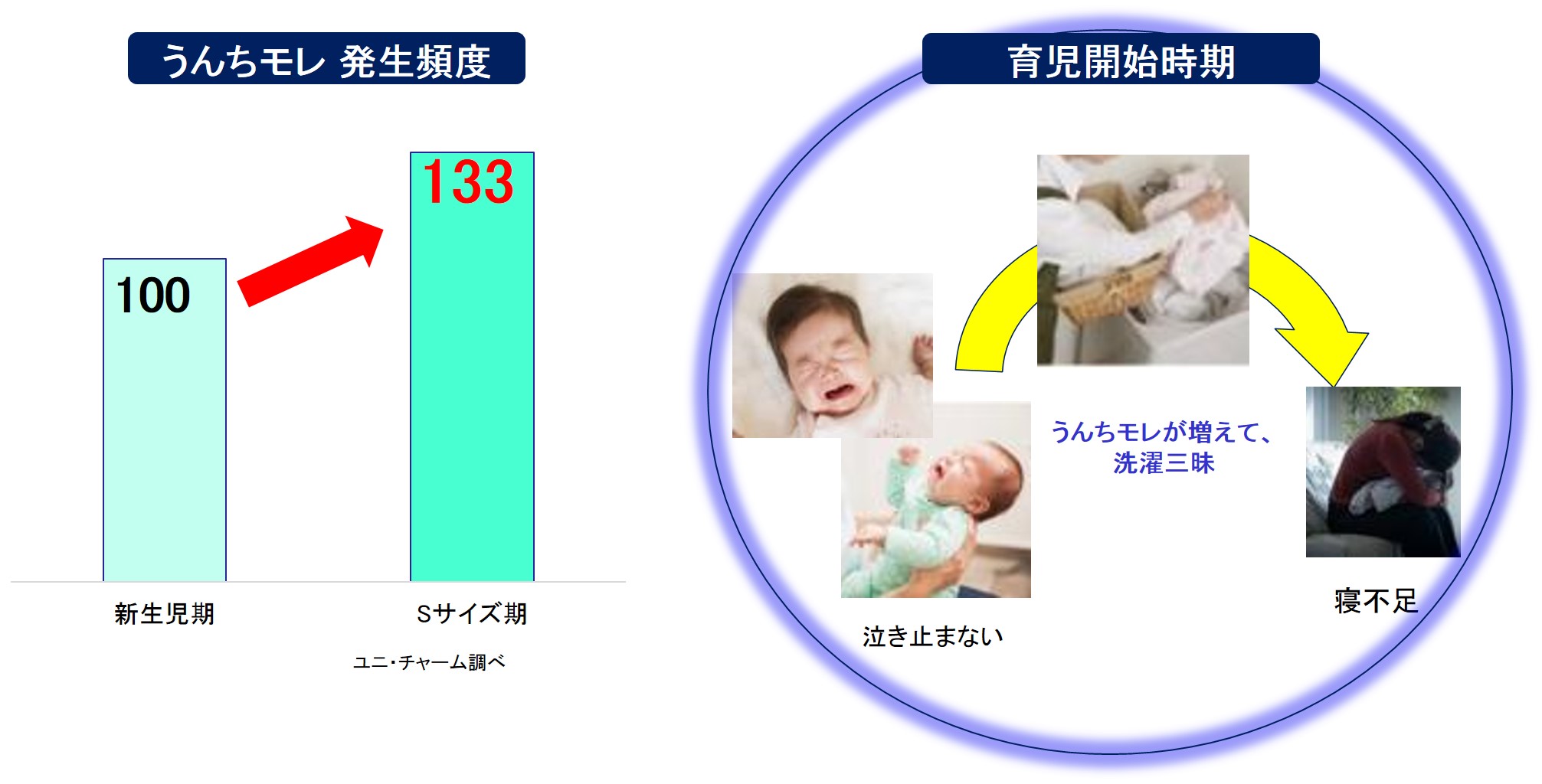 この時期は、赤ちゃんが泣き止まない、授乳がうまくいかない等様々な問題に直面している時期で、更に“ゆるゆる便”のモレが増えることによって、育児する方が洗濯三昧になり、その結果睡眠不足になることがあります。このように、 “ゆるゆる便”のモレに対する困窮度は非常に高くなっています。