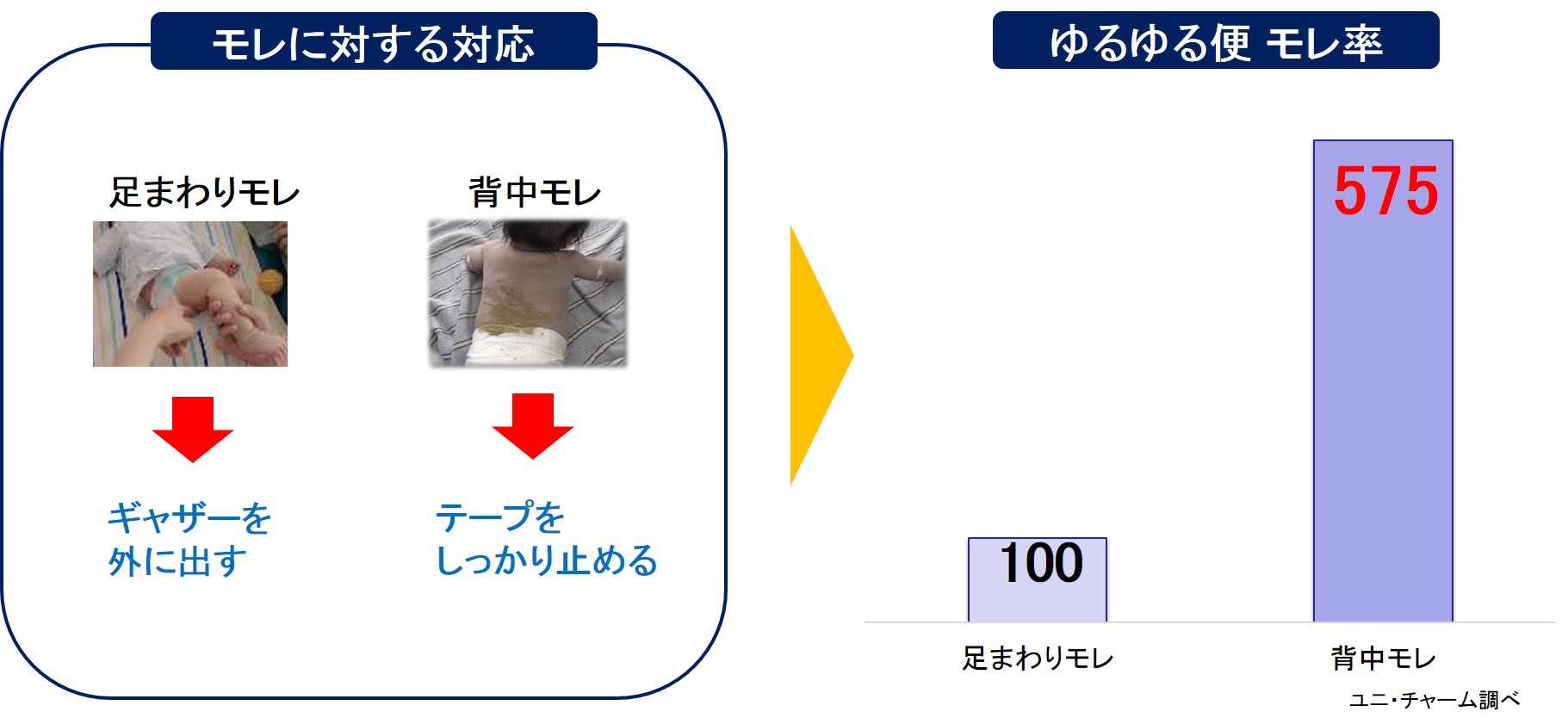 “ゆるゆる便”のモレの多くは背中から発生しています。足まわりモレは、「ギャザーを外に出す工夫」を実践することでモレを低減できているものの、背中モレは、解決が難しく、多くの方があきらめています。