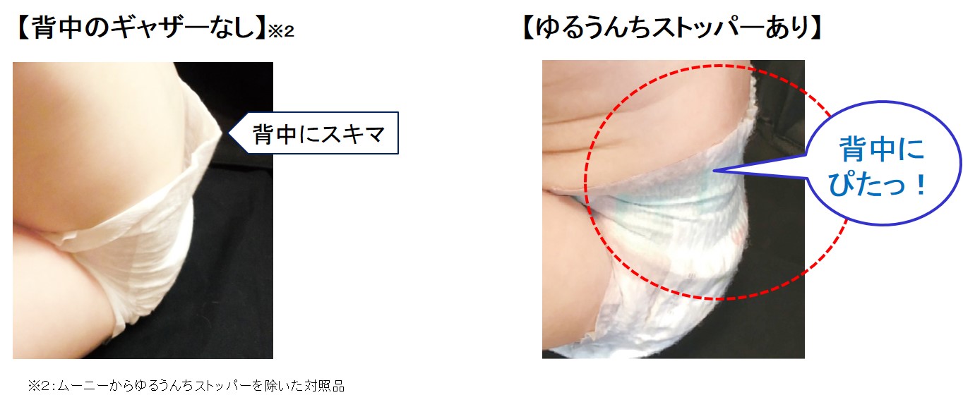 そこでこのたび、“ゆるゆる便“の背中モレを防ぐ、「ゆるうんちストッパー」を搭載した「ムーニー エアフィット※1」を、2020年4月上旬より全国で発売します。