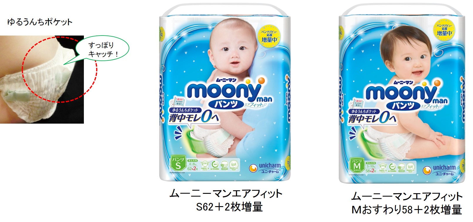 そこで、今回は大量の“ゆるゆる便”もすっぽりキャッチする「ゆるうんちポケット」が高評価のムーニーマンエアフィットSサイズ、Mおすわりサイズから、2枚増量の企画品を限定発売し、パンツ使用を促進します。