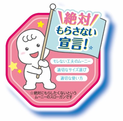 ☆ムーニーは、「絶対もらさない宣言」というスローガンを掲げ、テープ・パンツ両タイプでモレを解決する施策を提案し、今後も「育児負担軽減」に取り組んでいきます。