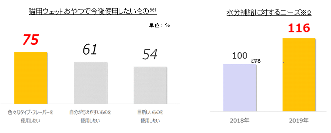 今回新たに、飼育者の約8割※1の方が、猫用ウェットタイプのおやつに対して「色々なタイプやフレーバーを与えたい」と考えていることがわかりました。また、積極的に水分摂取をしない猫を不安に思い、食事を通して水分補給ができることを重視する方も増加しています。※2