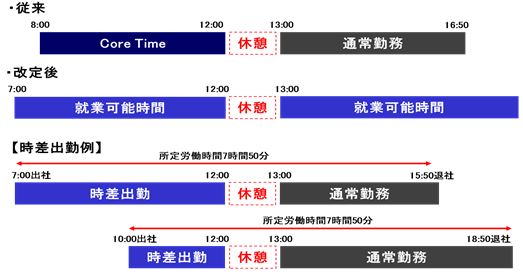 - 従来までのコアタイム8:00~12:00は撤廃とする。