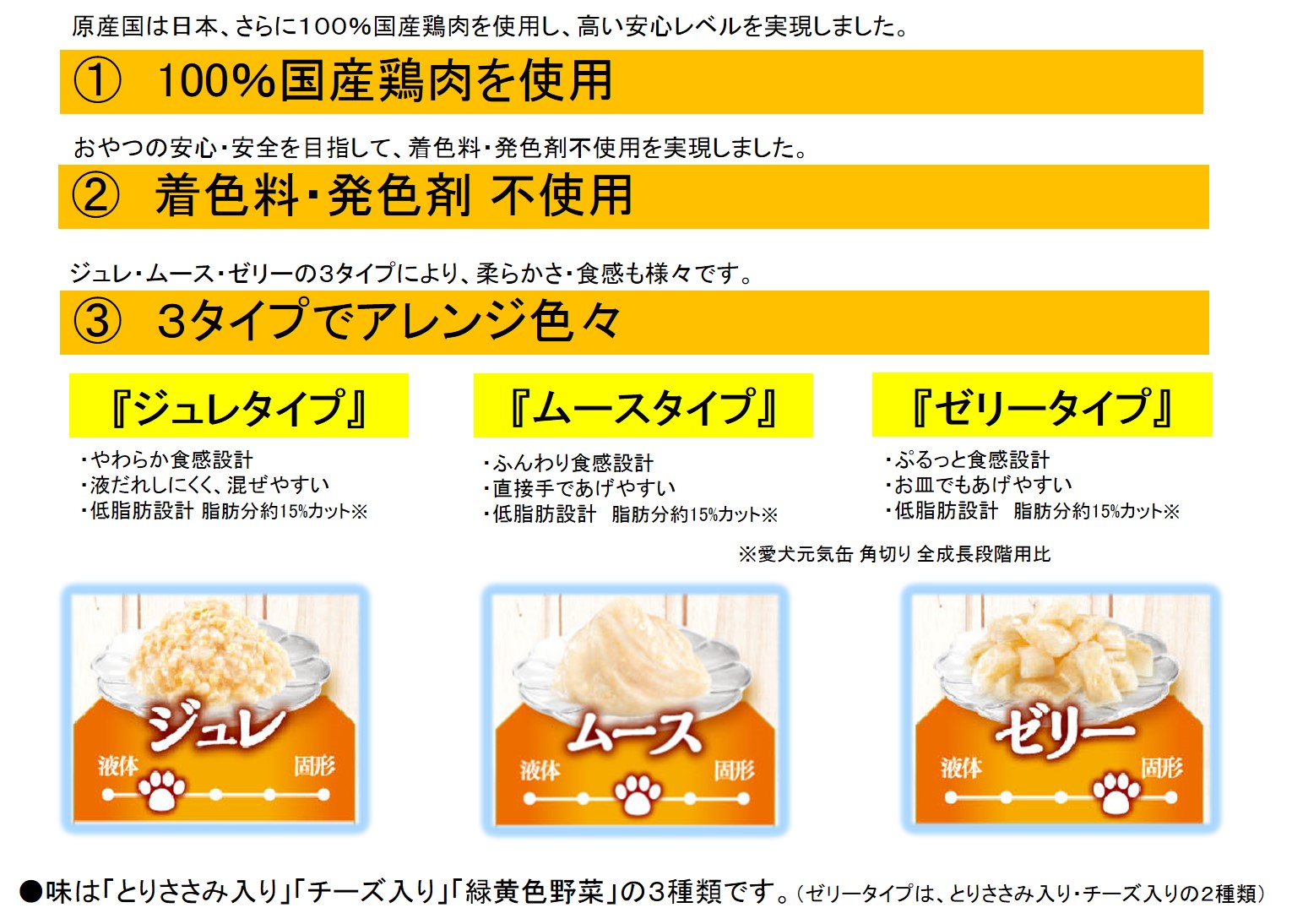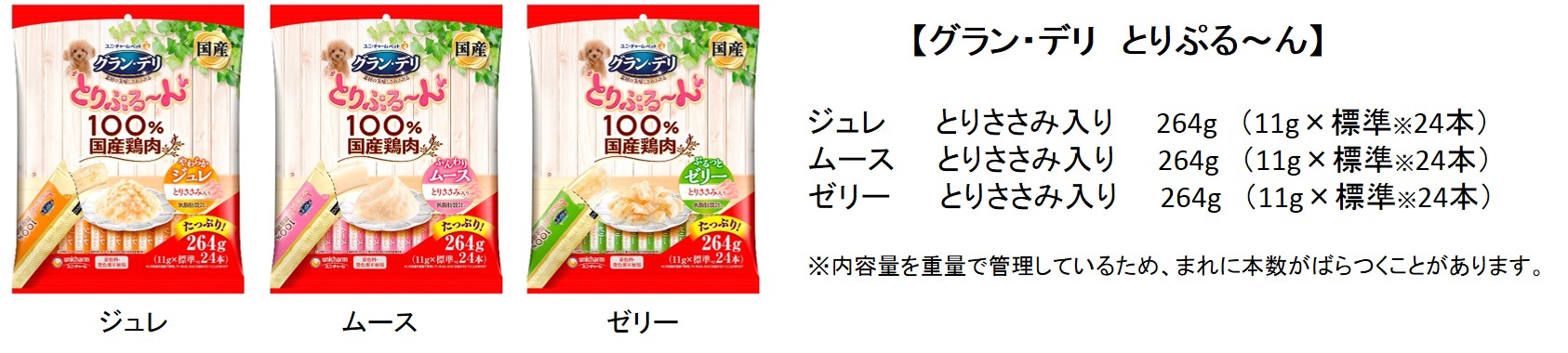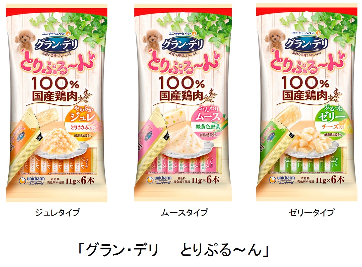 ユニ・チャーム株式会社(本社:東京都港区、代表取締役 社長執行役員 : 高原豪久)は、愛犬の副食新3大トレンド(①家族化&バラエティ化 ②美味しさ&安心の高度化 ③食べ悩み※1&対処方法進化)に向けた新提案として、「100%国産鶏肉を使用」「着色料・発色剤 不使用」の『グラン・デリ とりぷる~ん』を、ぷる~んとした新触感のジュレ・ムース・ゼリーの3つのタイプで、2020年7月27日に全国で新発売します。