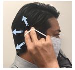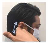 耳かけ部を両手で持ち、軽い力で2.3回程度、伸縮させ耳の後ろに負担がかかりにくいようになじませる。