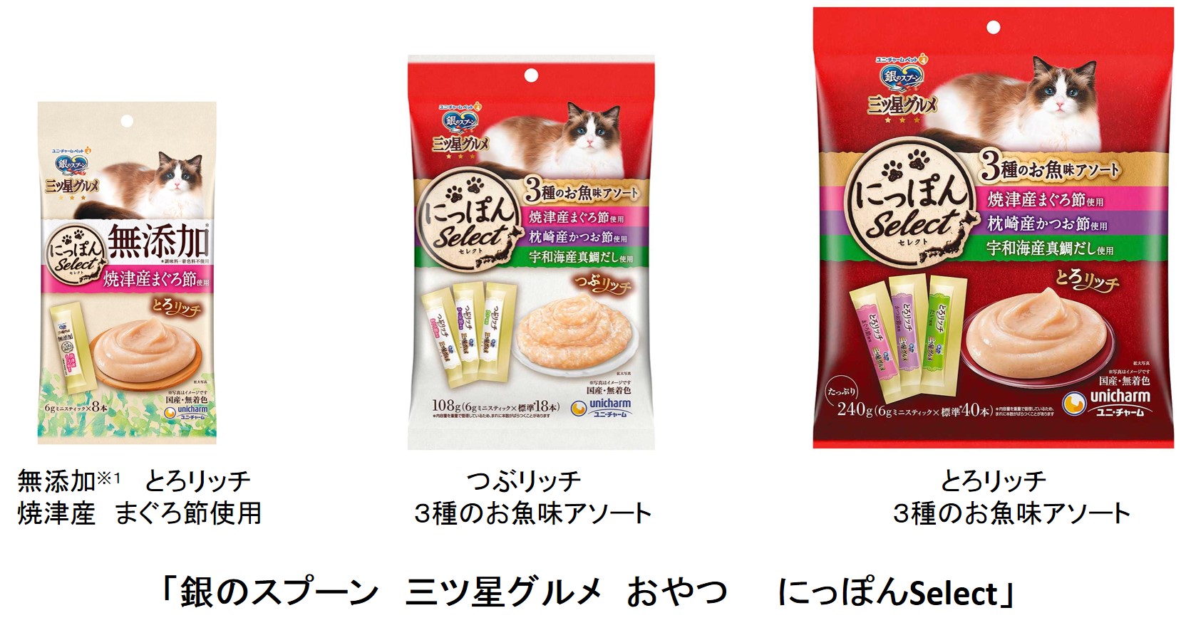 ユニ・チャーム株式会社(本社:東京都港区、代表取締役 社長執行役員:高原豪久)は、愛猫の副食に向けた新提案として、『銀のスプーン 三ツ星グルメ おやつ』から、まとめ買いニーズにお応えした“特大パック”と、安心ニーズにお応えした“無添加※1タイプ”を、2020年10月12日に全国で新発売します。