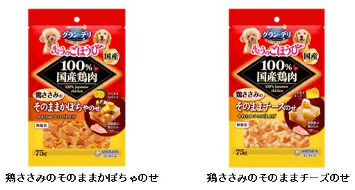 ユニ・チャーム株式会社(本社:東京都港区、代表取締役 社長執行役員:高原豪久)は、ご好評をいただいているジャーキータイプの犬用おやつ『グラン・デリきょうのごほうび』シリーズより、100%国産鶏肉を使用した生地に、かぼちゃやチーズをトッピングした『グラン・デリきょうのごほうび 鶏ささみのそのままかぼちゃのせ・そのままチーズのせ』を、2020年9月14日に全国で新発売します。