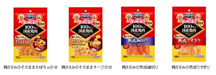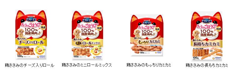 『グラン・デリきょうのごほうび』シリーズのパッケージのデザインを、100%国産鶏肉を使用し、安心して与えられるおやつであることがより伝わりやすいように改良し、発売します。