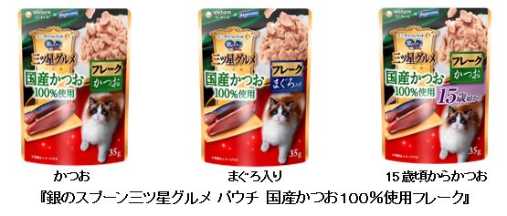 そこでこの度、日本の漁港で水揚げされた国産かつおを100%使用したフレークをゼリーに仕立てたねこ用ウェットフード『銀のスプーン三ツ星グルメパウチ 国産かつお100%使用フレーク』を2020年9月14日に全国で新発売します。