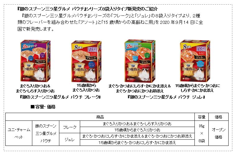 ユニ・チャーム株式会社(本社:東京都港区、代表取締役社長執行役員 : 高原豪久)は、ねこ用ウェットフード『銀のスプーン三ツ星グルメパウチ』シリーズより、国産かつおを100%使用したゼリー仕立てのねこ用ウェットフード『銀のスプーン三ツ星グルメ パウチ 国産かつお100%使用フレーク』を、2020年9月14日に全国で新発売します。
