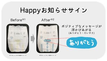 赤ちゃんがおしっこをすると「ありがとう」「だいすき」といったポジティブなメッセージが浮かびあがる“Happyお知らせサイン”を採用しています。