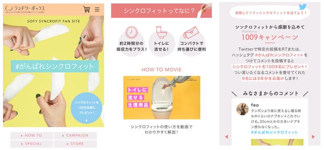 そこでこの度、ファンの声に支えられて『#がんばれシンクロフィット』プロジェクトを、2020年10月9日より始動します。カラダやココロの悩みに寄り添うプラットフォーム「ランドリーボックス」内にシンクロフィットのファンサイトを開設し、プレゼントキャンペーンを通して、隠れた大ヒット商品である生理用品ソフィシンクロフィットをより多くの人々にお届けするとともに、生理期間の悩みをはじめとした様々な声に寄り添う活動を行って参ります。
