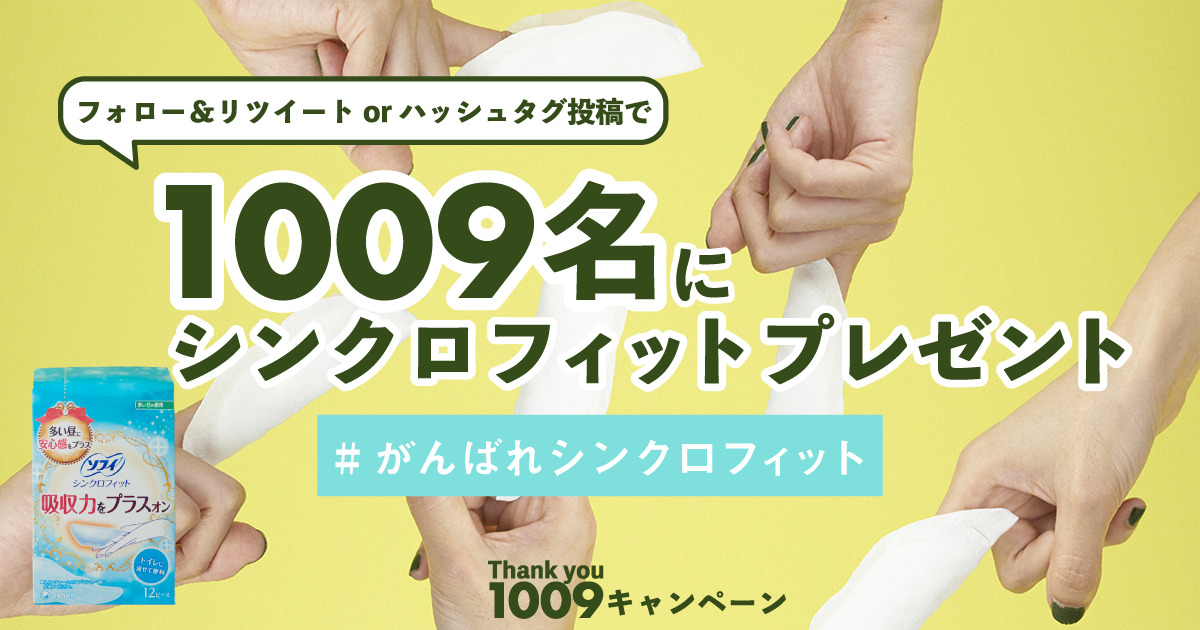 ハッシュタグ『#がんばれシンクロフィット』をつけて、ソフィ シンクロフィットへのメッセージや使用エピソード、ファンサイトへ掲載する記事への感想などをTwitterで投稿、または該当ツイートをリツイート、引用リツイートいただいた方の中から抽選で1009名様にソフィ シンクロフィットをプレゼントします。