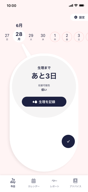 毎月の生理終了日に、生理や体調の状態、体質改善に役立つアドバイス、「やること」の達成率をサマリーでレポート!1ヵ月の振り返りができます。