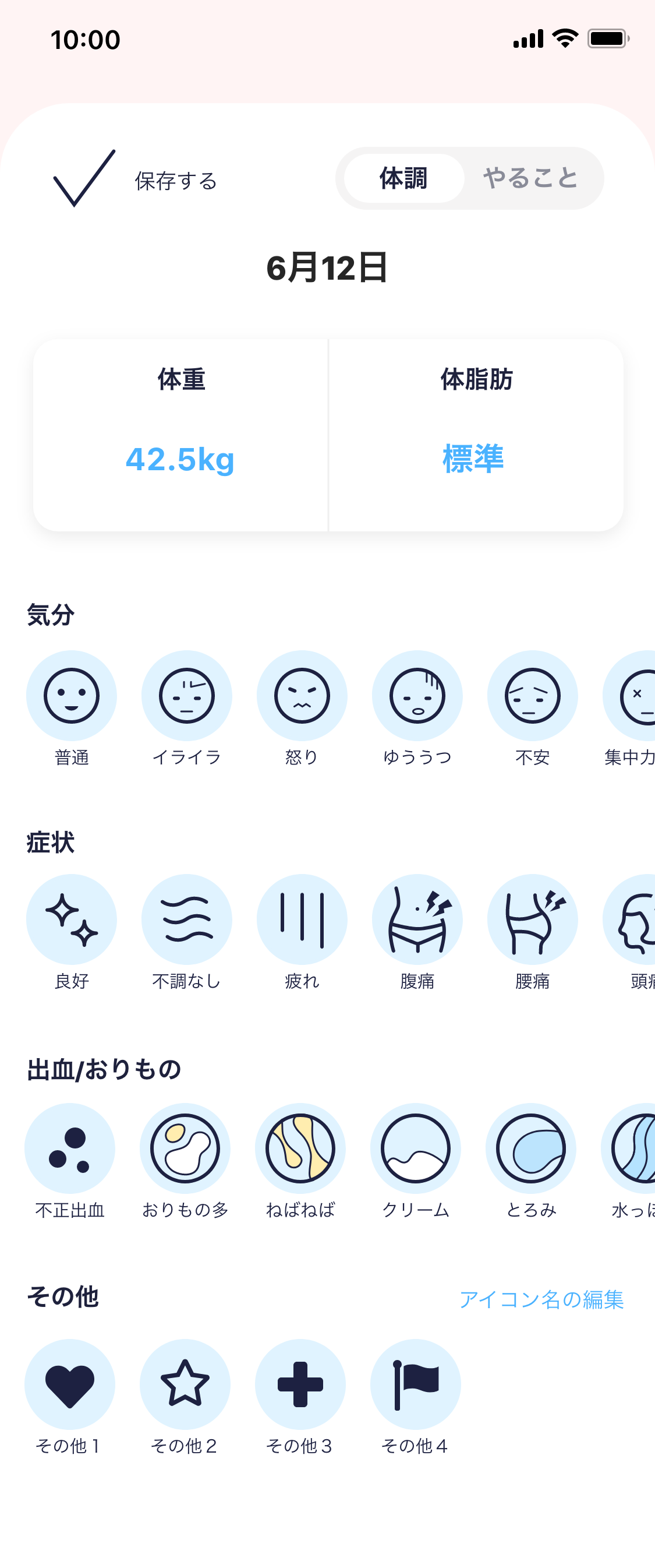 - 「その他」のアイコンは、好きなアイコン名に編集でき、自分に合った項目の記録をすることができます。